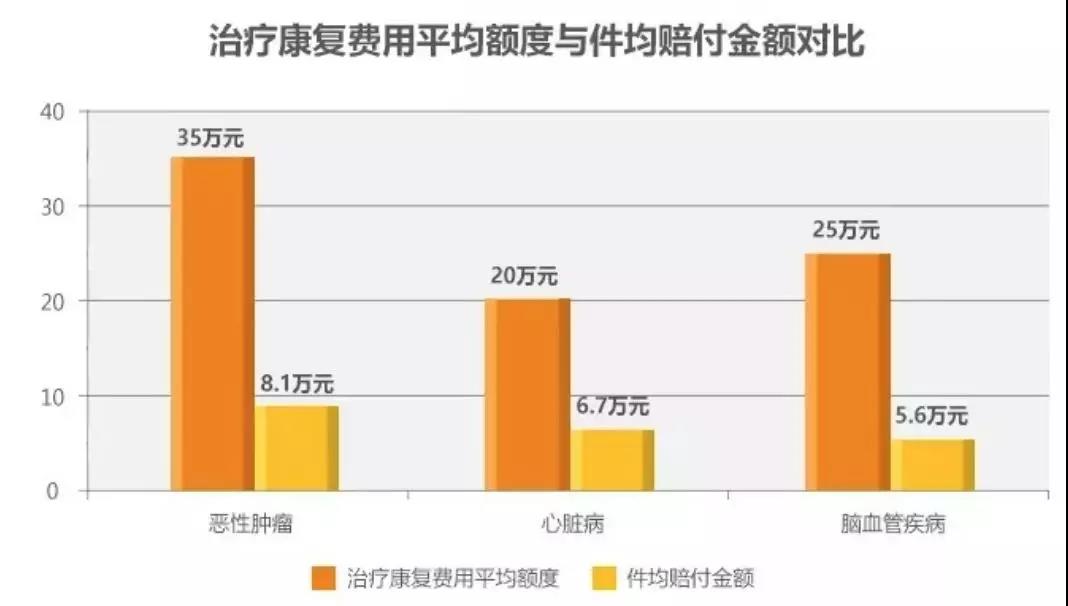此外,常见的重大疾病平均治疗康复费用分别为:恶性肿瘤35万,心脏病20万,脑血管疾病25万。
