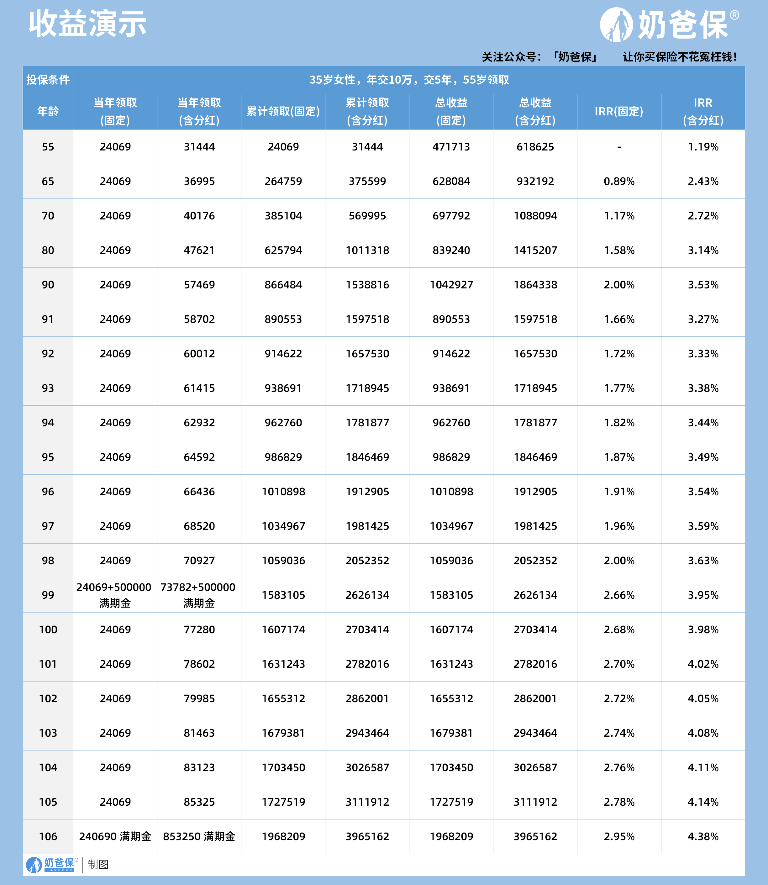 接下来我们看看收益情况,以35岁女性年交10万交5年,55岁开始领取为例,