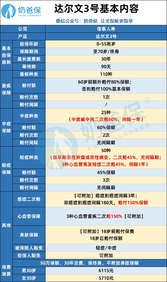 达尔文3号是信泰人寿在6月底推出的,在6月还推出了超级玛丽3号max,详细的测评文章,奶爸之前已经写过了,可以点击《超级玛丽3号max重疾险测评,重疾能赔1.8倍保额》