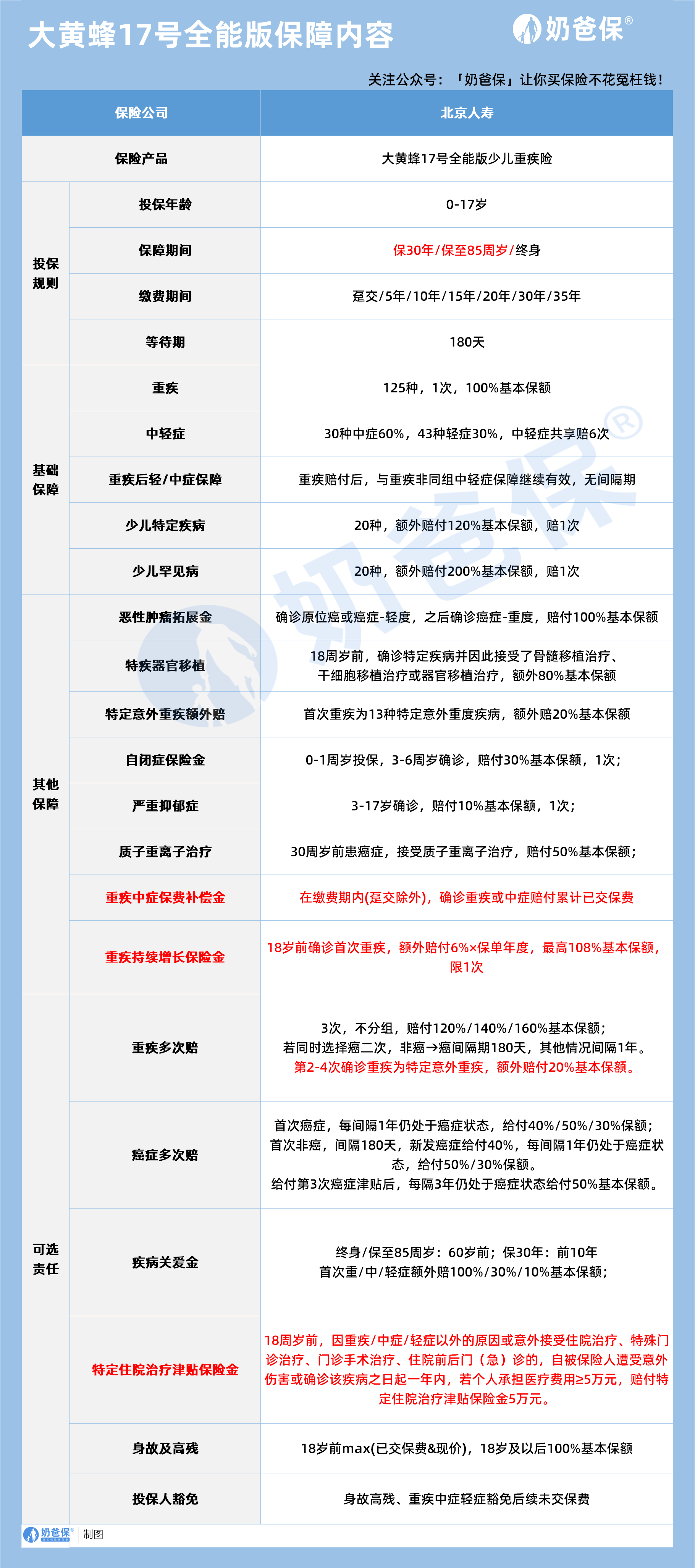 大黄蜂 17 号全能版在少儿特定保障和癌症保障上全面升级,适配少儿成长阶段的保障需求。