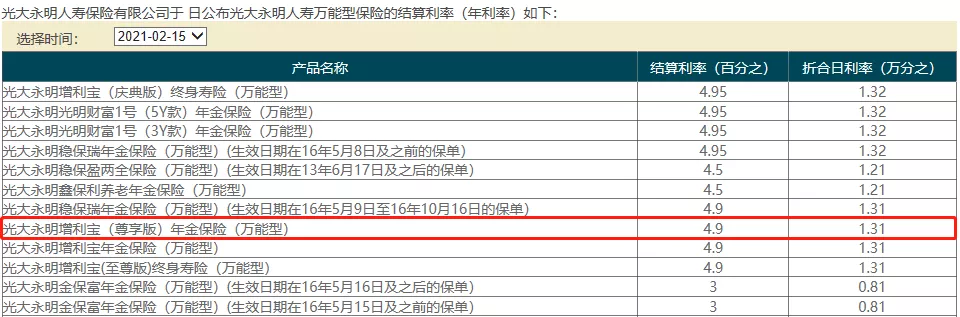 光大永明钻多多年金险的万能账户名为增利宝(尊享版),保底利率为3%,目前结算利率达4.9%;