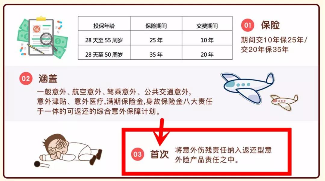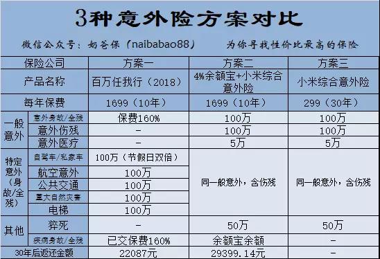但大部分的返还型意外险只有全残责任,是没有意外伤残责任的。也就是说假如意外残疾了,伤残评定未达到全残的等级,返还型意外险是不会赔的。 举个栗子:假如老王不幸撞车导致“颅脑损伤导致重度智力缺损(智商等于34)”,最终鉴定为2级伤残。 如果他买了带100万伤残责任的综合意外险,他是可以拿到100万*90%=90万的赔付。但如果不幸买了上述华夏逍遥行、全球同方畅行无忧以外的其他返还型意外险,他是一分钱也拿不到。 实际上,如果残疾达到一定程度,不仅造成劳动能力的下降或者丧失,随之而来的康复费用、护理费用等也可能变成家庭的巨大负担,其带来的严重影响有时候会比身故更严重。如果一份意外险连伤残责任都不包含,那跟一条没有梦想的咸鱼又有什么区别? 如果投保的时候不清楚这些细节,理赔的时候才发现不赔,那这样的保险不是“骗人”,又是什么? 3、保费高,性价比低我们分析一下以下3种意外险的配置方案: