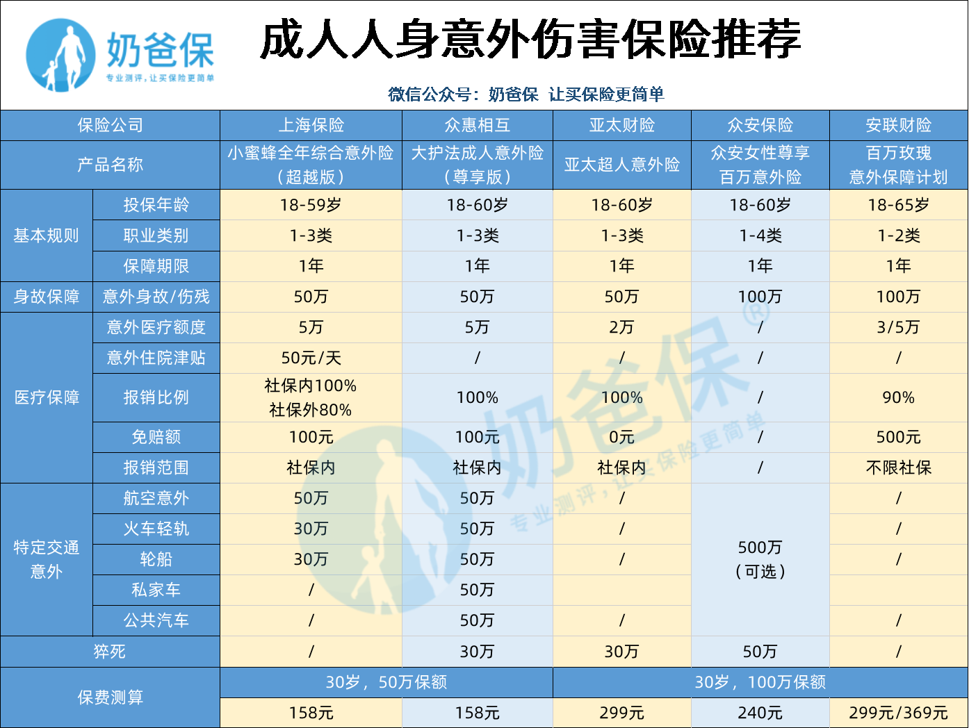 从表中可以看到,30岁成人的人身意外伤害保险价格最高也是300多,而且花300多就能获得100万保额,杠杆真的很高。