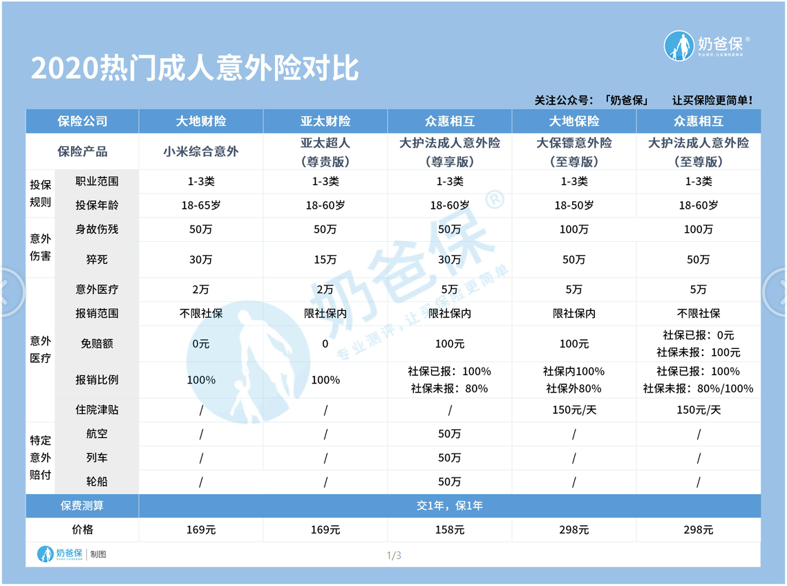说完少儿意外险,奶爸再说说现在市面上比较热门的成人意外险,对比表格如下: