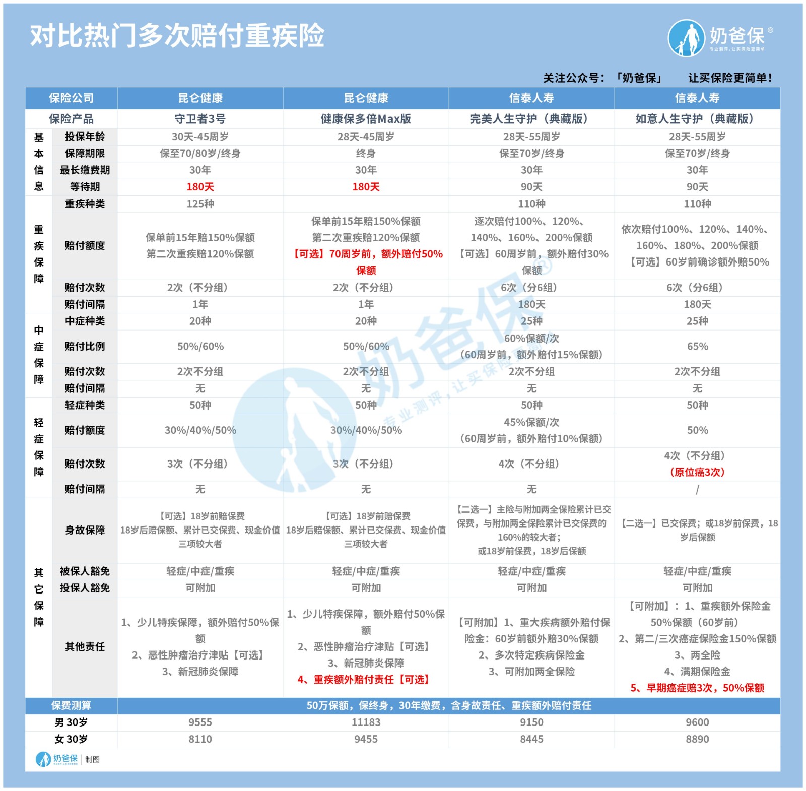 以上就是多次赔付重疾险的测评,从保费来看,50万保额,30年交,保终身,含身故责任而且附加重疾额外赔付,较贵的是健康保多倍max版,每年要11183元,最便宜的是完美人生守护典藏版,每年只要9150元。