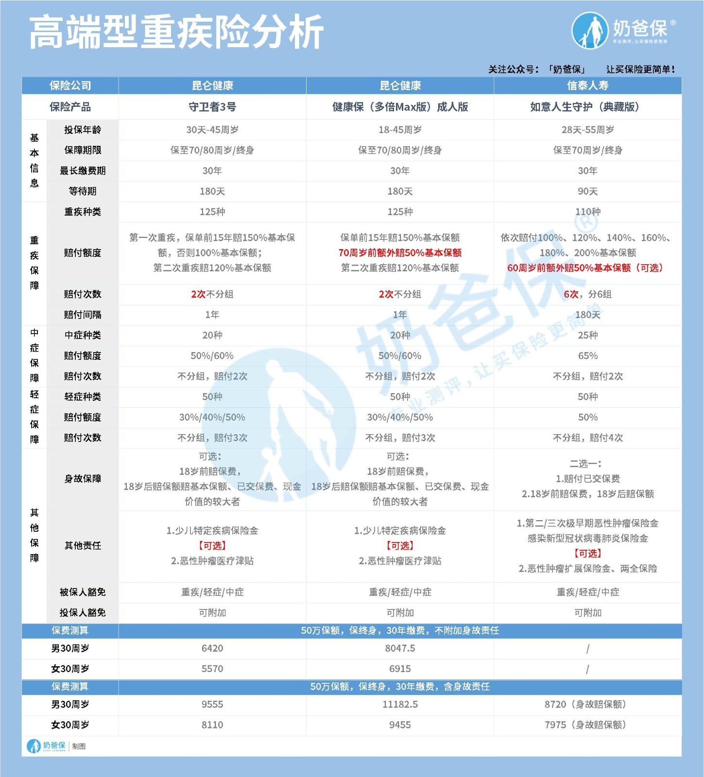 以上就是中端重疾险分析,适合预算稍微宽松的人群,然后奶爸要讲的是高端重疾险,适合预算比较充足的人群,产品的对比表格如下: