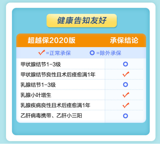 超越保2020的健康告知对带病人群比较友好,有甲状腺结节良性且术后痊愈满1年、乳腺疾病良性且术后痊愈满1年和乳腺小叶增生等情况都可以正常承保。