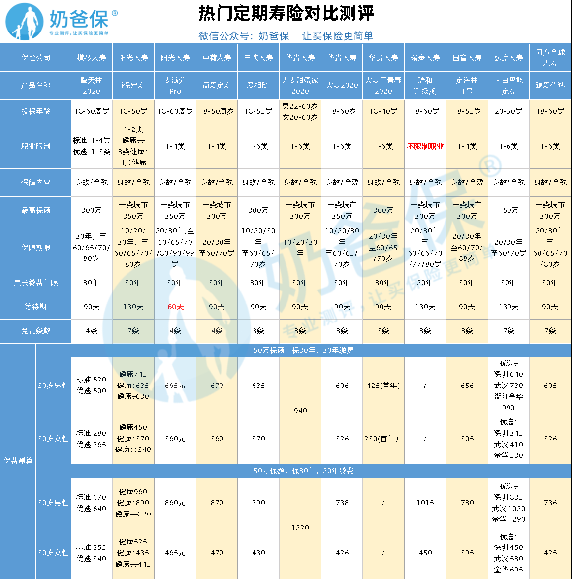 基于上述寿险的评判维度,奶爸挑选了8款市面热门的定期寿险产品,进行对比分析: