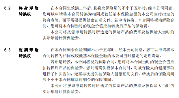 投保超过5年,可以免健康告知转换为保障时间更长的定期寿险、终身寿险,不过新产品必须由保险公司指定。