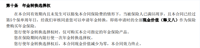 被保人同时满足(购买超过5年&没有保费豁免&满55周岁),可选择转换为保险公司指定的年金险。