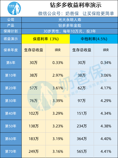 钻多多的缴费期分为3年和5年,年金险在总保费相同的情况下,缴费时间越短,收益就会越高。