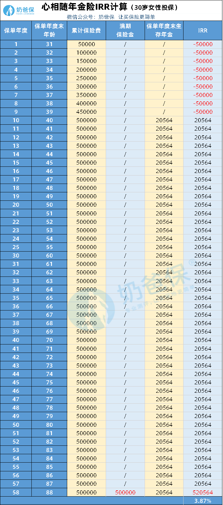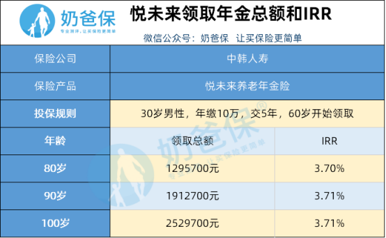 以30岁女性,年缴费5万元,交10年为例,心相随年金险的IRR可以达到3.87%。