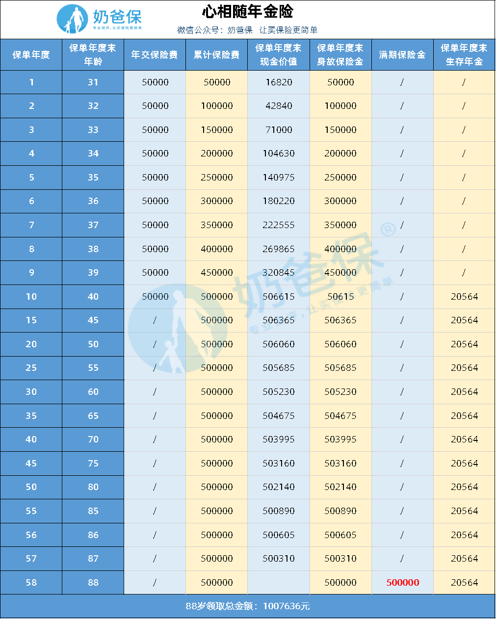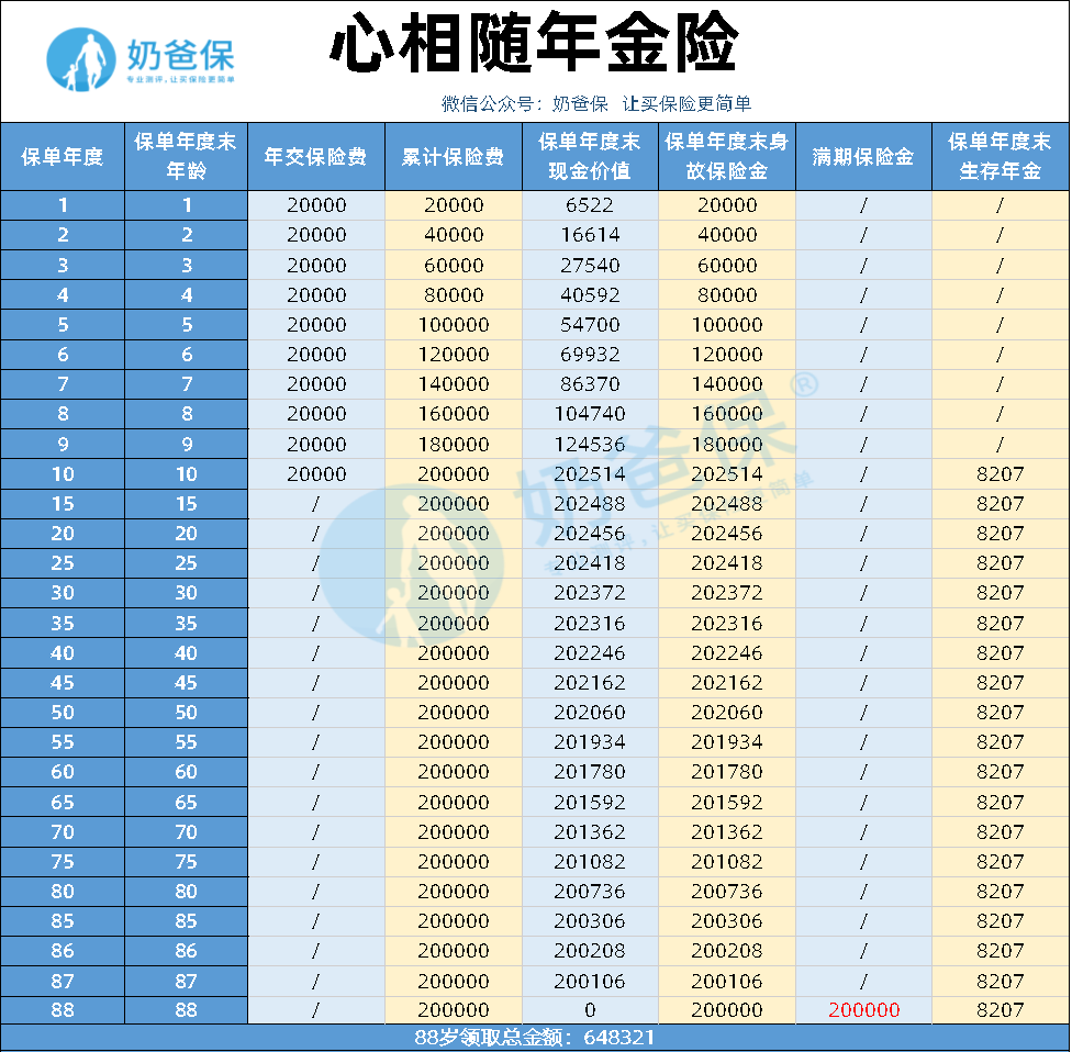 我们可以来看看,心相随年金险的年金和满期返还加起来能领多少钱。
