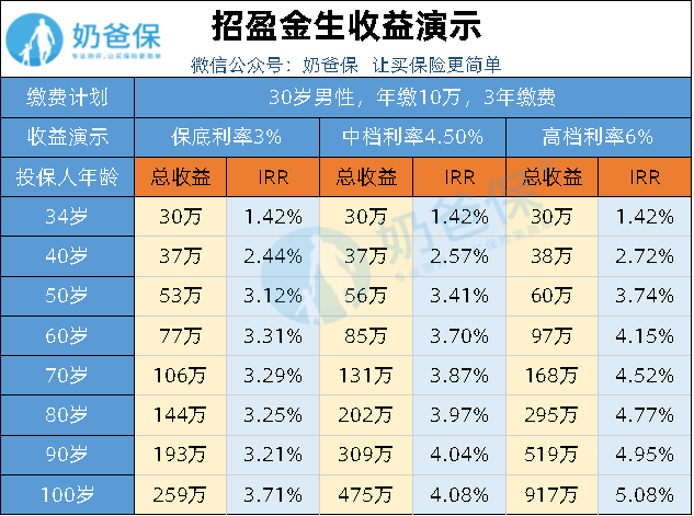 奶爸以0岁男孩,年交2万保费,交10年为例,来看看IRR究竟有多高: