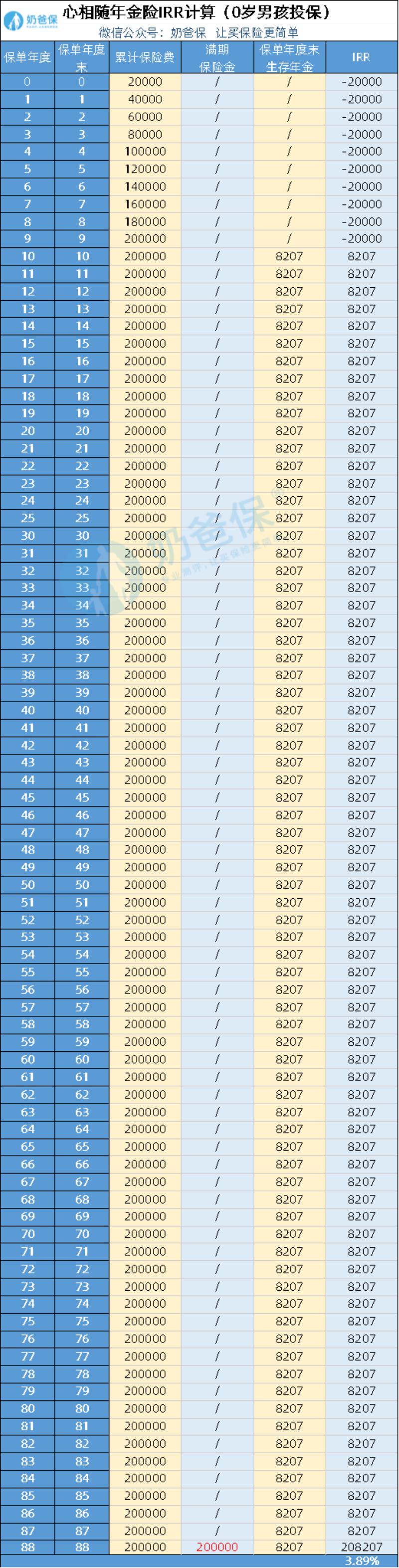 0岁男孩年缴费2万,交10年,IRR可达到3.89%。