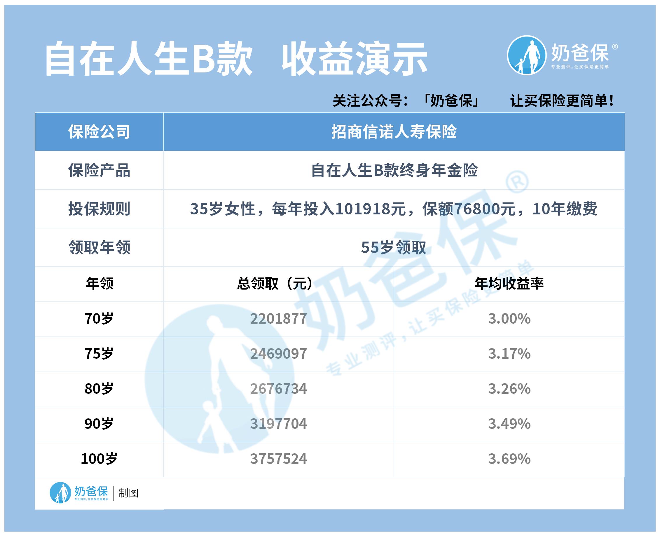 可以看到自在人生B的收益率达到3%,年纪越大,后续收益率也越高,而且较为稳定。