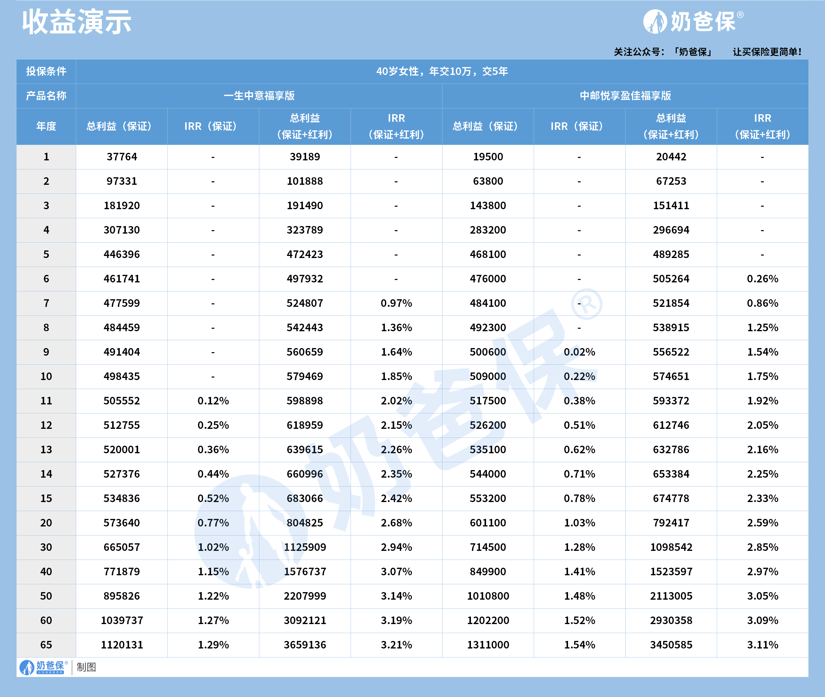 第40年,中意保证利益内部收益率1.15%,中邮为1.41%,