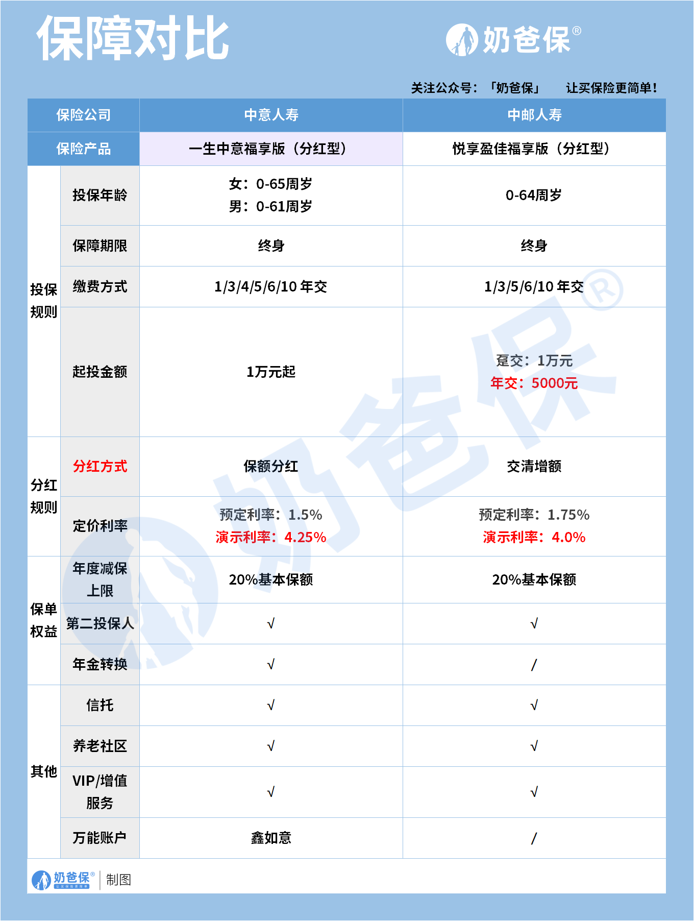预定利率方面,中邮悦享盈佳福享版1.75%高于中意一生福享版1.5%,