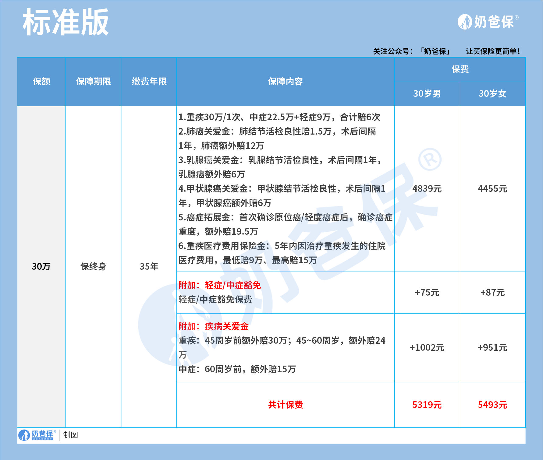 30岁男性买30万保额,附加疾病关爱金,