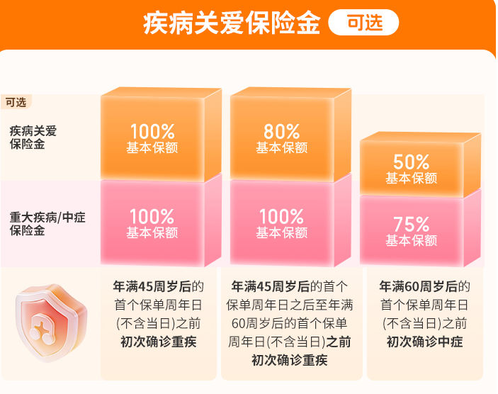 基础保障+轻中症豁免+疾病关爱金。