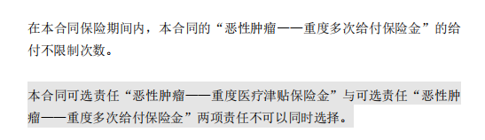 癌症津贴或癌症多次赔(二选一):间隔一定周期后,可以赔一笔钱用于癌症持续治疗,癌症津贴有次数限制,多次赔则不限次数。