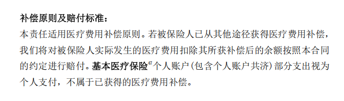 同时,这项医疗费用责任遵循补偿原则,若被保险人已通过社保、单位福利、其他商业保险等途径获得医疗费用补偿,保险公司仅对扣除补偿后的剩余费用按约定赔付,