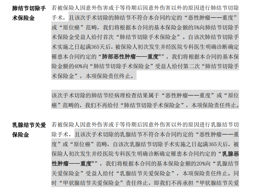 分别对应肺结节切除手术保险金、乳腺结节关爱保险金、甲状腺结节关爱保险金。
