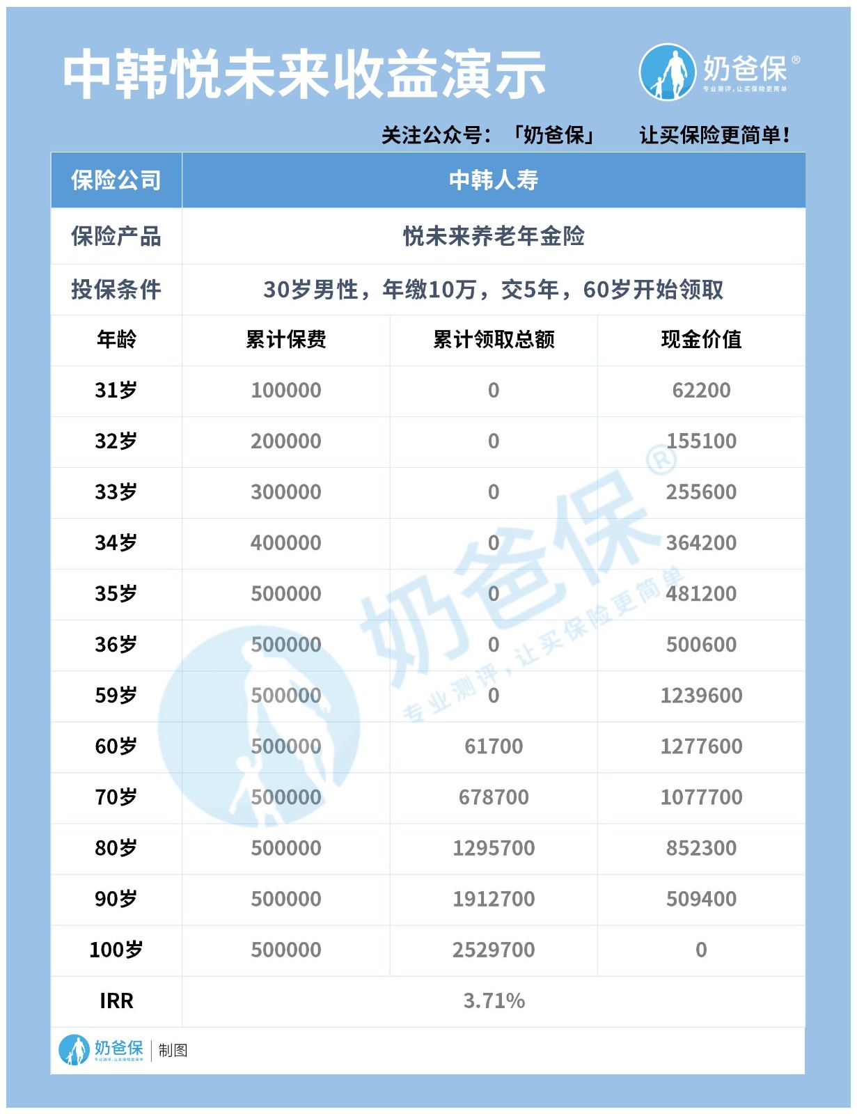 同时从上表可以看到,中韩悦未来的IRR值高且稳定,因此其收益也是可以排在年金险产品中的第一梯队。