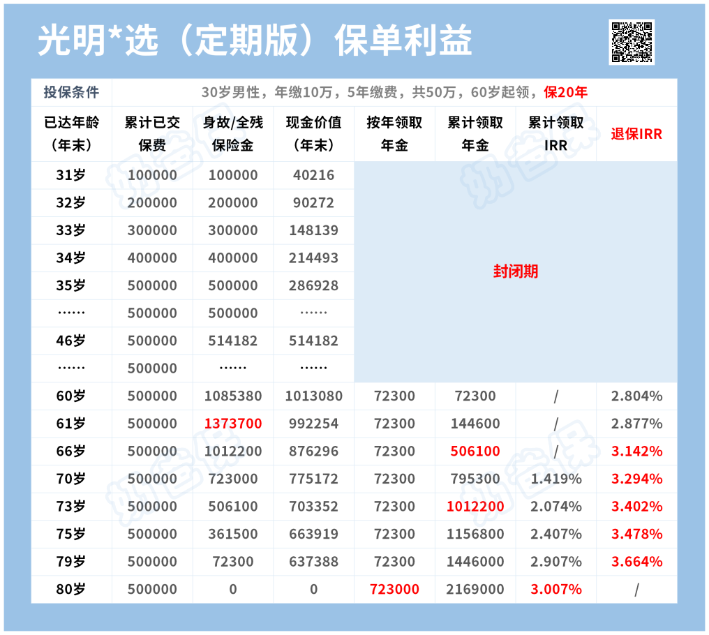 光明慧选有领取20年的定期版和终身领取版两个方案可选,满足不同人群的需求。