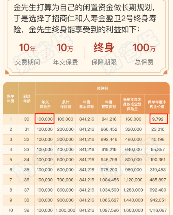 以招商仁和人寿金盈卫2号终身寿险为例,第一年我们投保10万元,保费为10万元,假设我们超过犹豫期在年度末退保,我们能拿回多少钱呢?只能拿回9792元,不到一万元,不足我们保费的一成,损失达到9万多远。