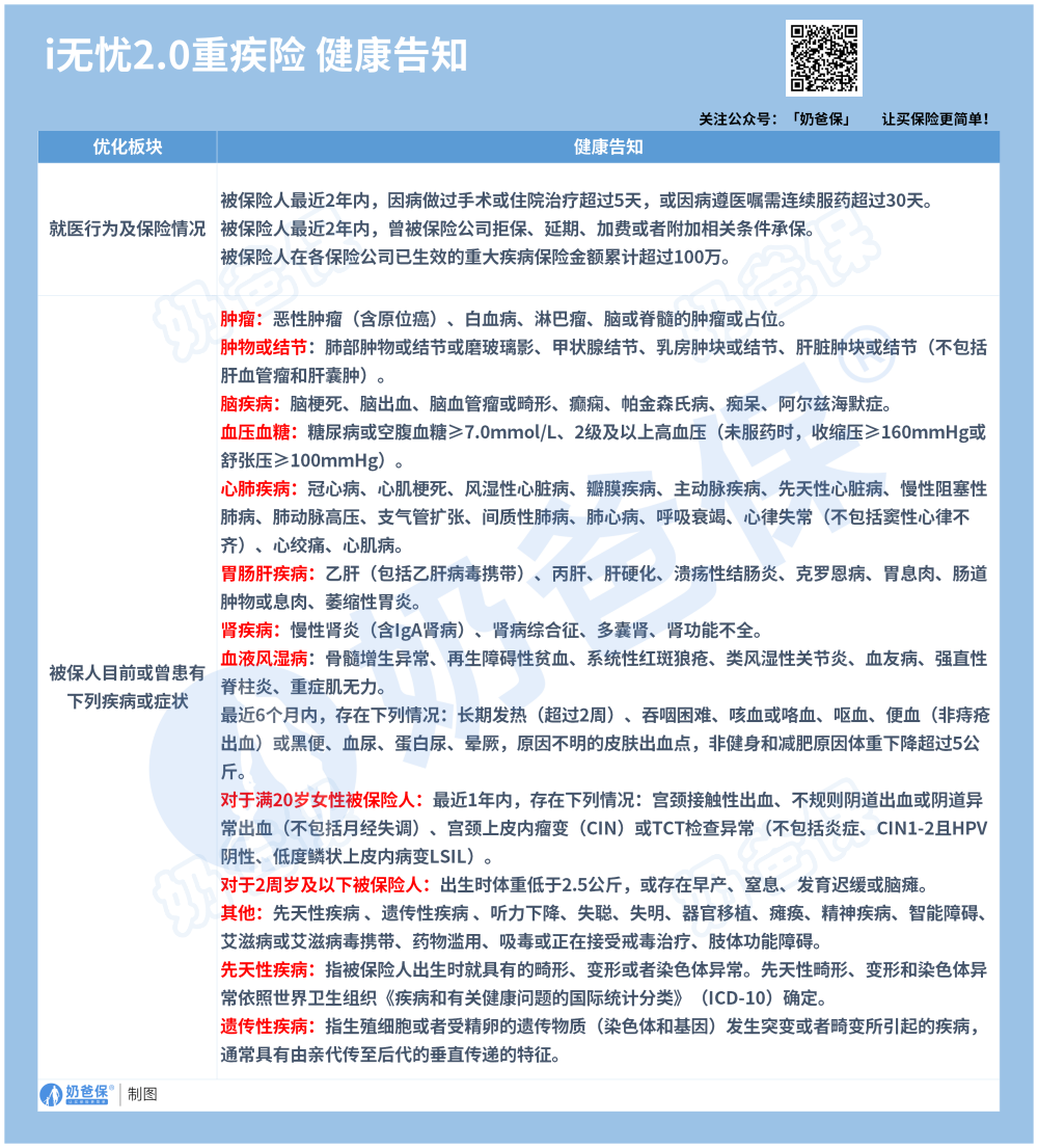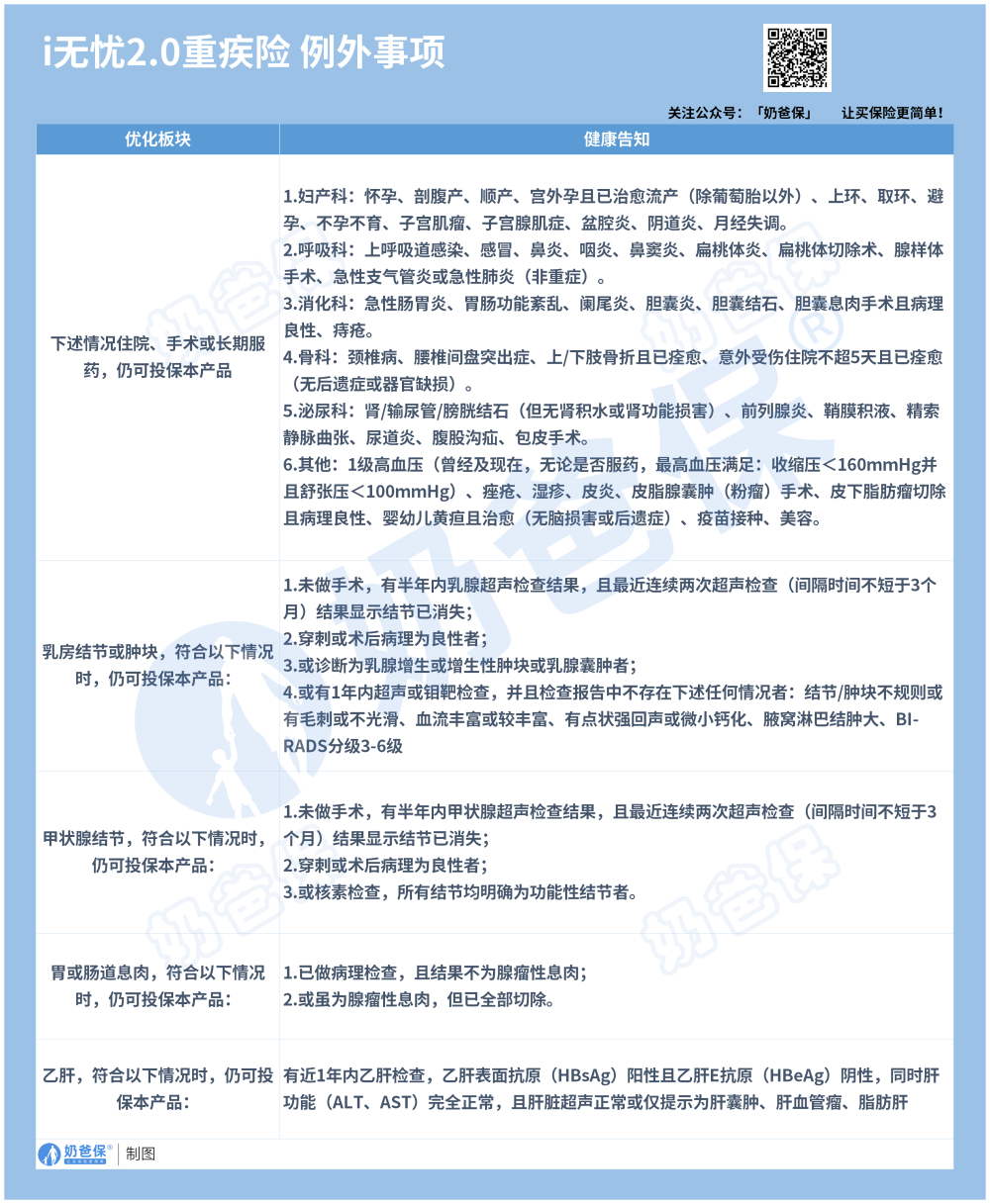 这位朋友你好,关于i无忧2.0重疾险健康告知怎么样,带病投保的例外事项有哪些的问题,奶爸在这里整理了有关i无忧2.0重疾险的相关内容,希望对你有帮助:
