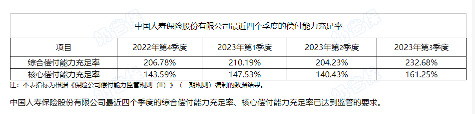 中国人寿第三季度2023年综合偿付能力充足率为232.68%;