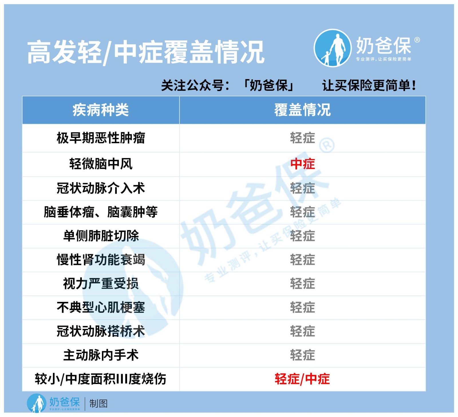 我们要注意高发轻中症疾病覆盖是否全面,奶爸整理了高发轻/中症覆盖情况图表: