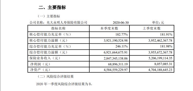 光大永明2020年第2季度核心偿付能力充足率182.77%,综合偿付能力充足率246.11%,2020年第1季度风险综合评级结果是B级。
