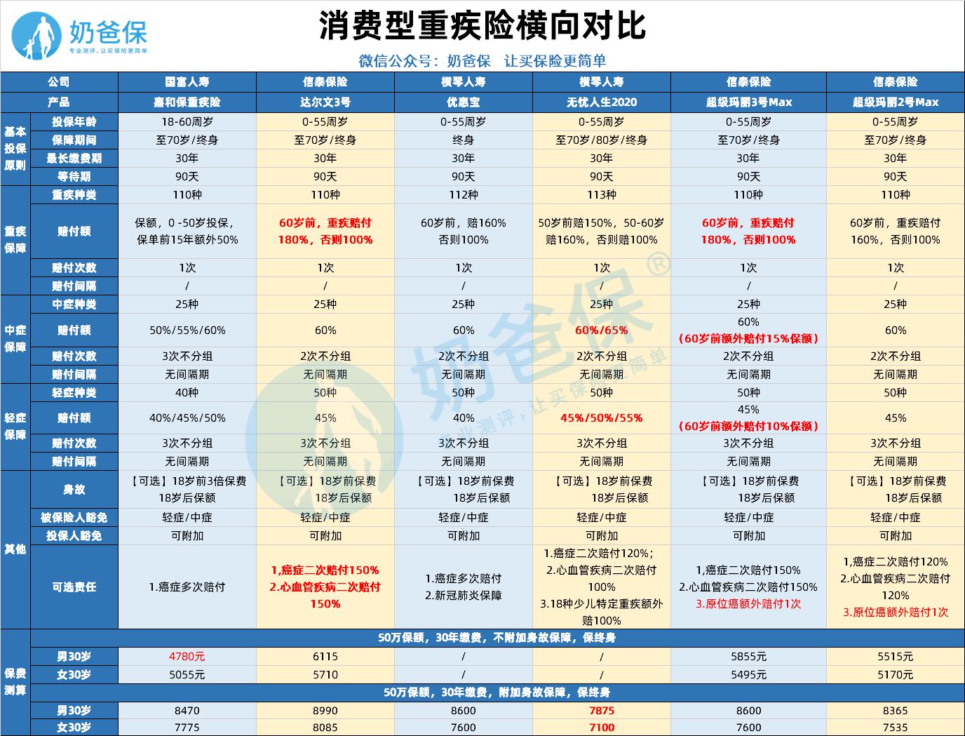 奶爸选择了市面上比较热门的几款重疾险进行对比: