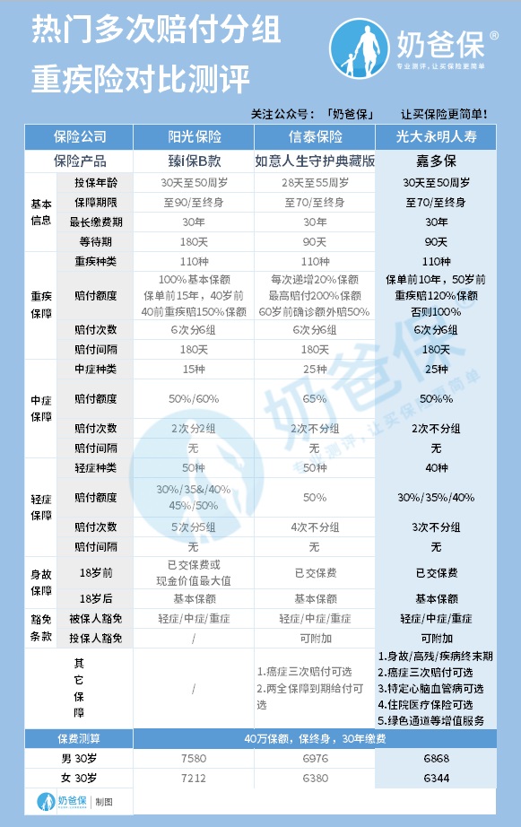 轻症保障40种疾病,常见高发轻症疾病全覆盖,不分组,无间隔期,可赔3次,保额随着赔付次数的增加而增加,第一次赔付30%基本保额,第二次35%,第三次40%。