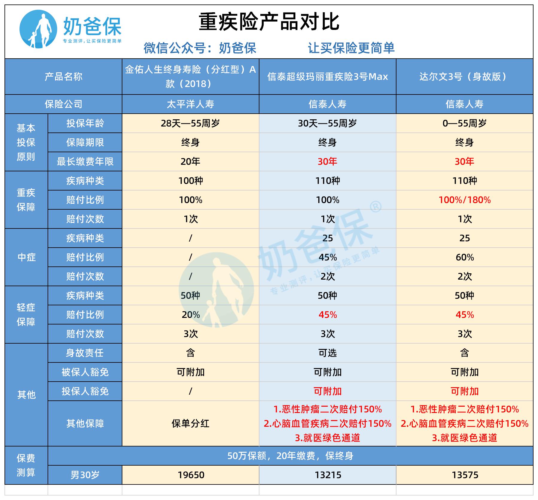 相比之下,信泰超级玛丽重疾险3号Max和达尔文3号这两款产品性价比较高,含“金佑人生”不包含的中症保障种类25种,赔付两次。