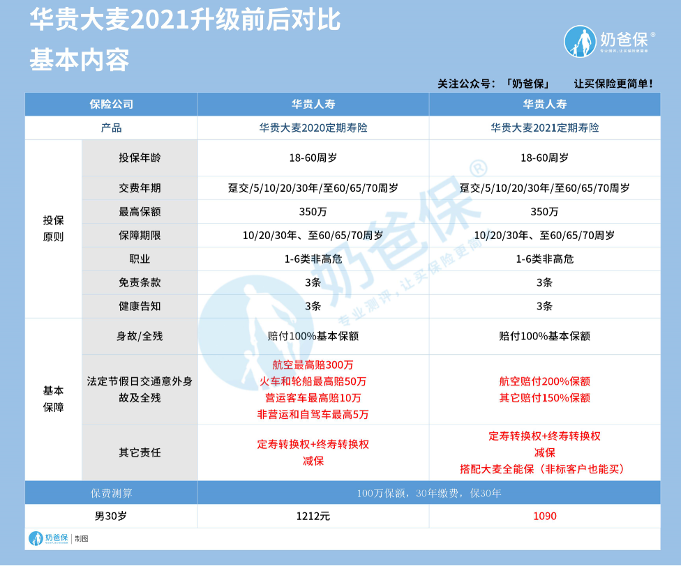 (1)法定节假日交通工具意外赔付不同大麦2020规定航空意外身故全残最高赔付300万,火车和轮船意外身故/全残最高赔50万,营运客车最高赔10万,非营运和自驾车最高赔5万而大麦2021规定航空意外身故/全残赔200%保额;其他交通工具赔150%。(2)非标客户可以转投大麦全能保对于大麦2021来说,即使客户不能通过智能核保,可以选择特制产品大麦全能保。奶爸经过分析,这款产品还是比较周到的。(3)保费不升反降大麦2021比大麦2020多了以上两种优势后,保费不但没有上升,反而下降了一些。