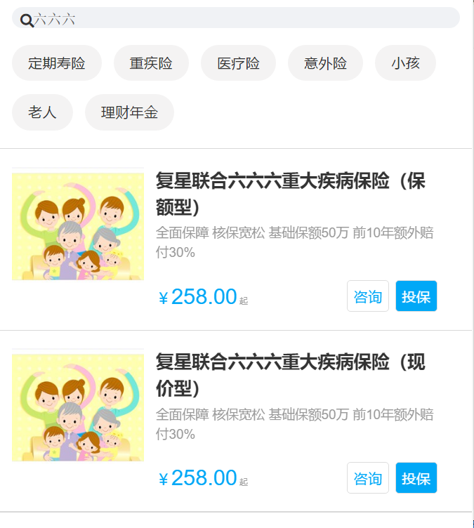 3、进入以后,在搜索框里面输入【六六六】,点击【投保】即可。