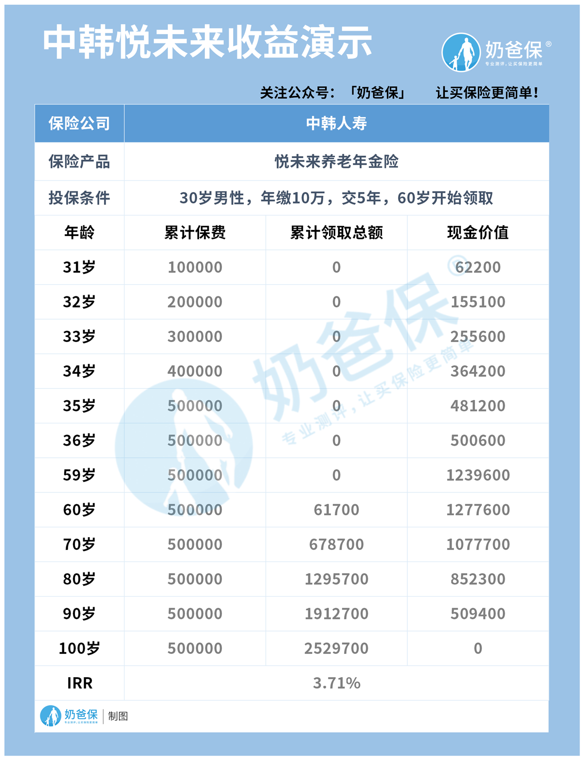 下面奶爸就拿一张中韩悦未来年金险的未来收益表来给大家说明一下: